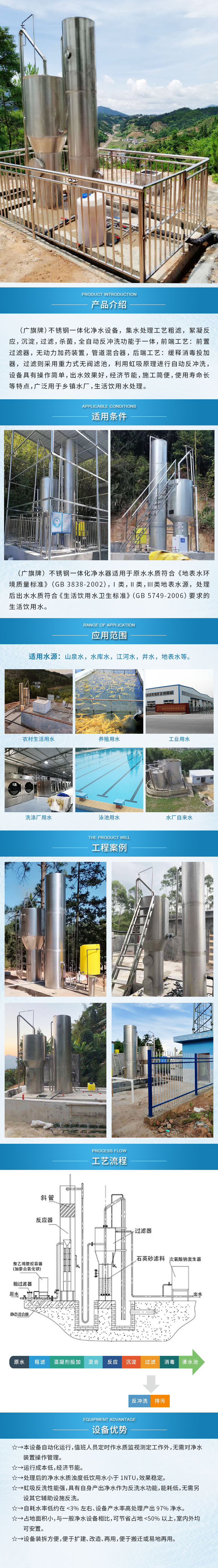 (廣旗牌)不銹鋼一體化凈水設(shè)備,集水處理工藝粗濾,絮凝反應(yīng),沉淀,過濾,殺菌,全自動反沖洗功能于一體,前端工藝:前置過濾器,無動力加藥裝置,管道混合器,后端工藝:緩釋消毒投加器,過濾則采用重力式無閥濾池,利用虹吸原理進行自動反沖洗,設(shè)備具有操作簡單,出水效果好,經(jīng)濟節(jié)能,施工簡便,使用壽命長等特點,廣泛用于鄉(xiāng)鎮(zhèn)水廠,生活飲用水處理。